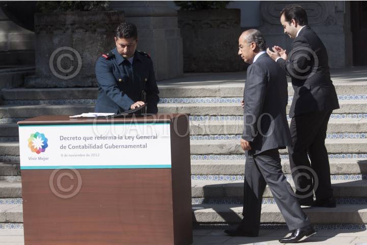 MÉXICO, D.F., 09NOVIEMBRE2012.- Felipe Calderón Hinojosa, Presidente de México, y Alejandro Poire, secretario de Gobernación, encabezaron la ceremonia en donde se firmo el decreto que reforma la Ley General de Contabilidad Gubernamental, iniciativa que mando el Jefe del Ejecutivo en calidad de preferente. FOTO: MOISÉS PABLO /CUARTOSCURO.COM