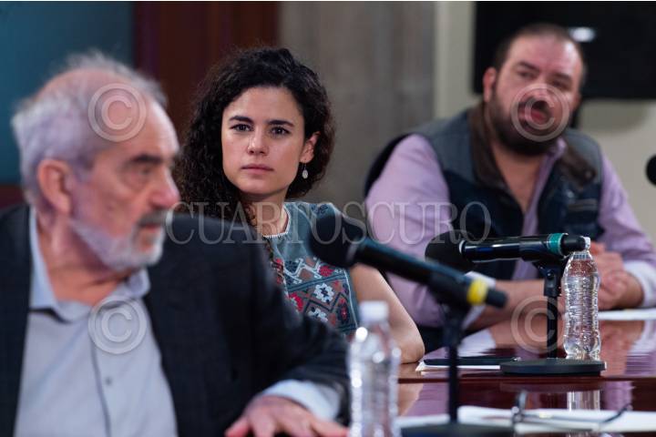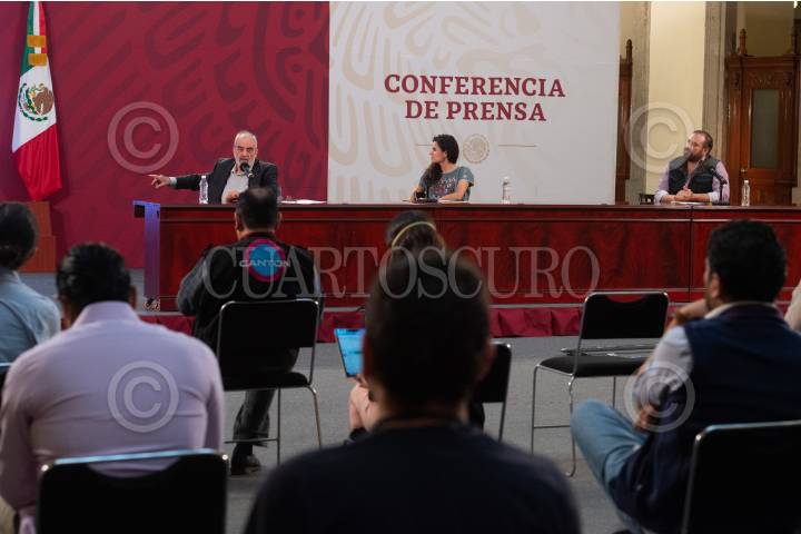 Luisa María Acalde Luján, Raymundo Artis Espriú, y Emiliano Calderón Mercado, durante las Conferencias del Bienestar.