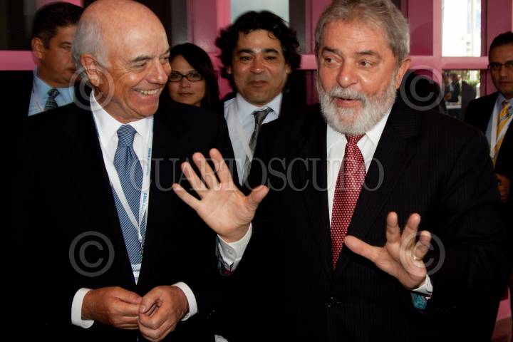 QUERÉTARO, QUERÉTARO, 25OCTUBRE2011.- Luiz Inácio Lula da Silva, ex presidente de Brasil, durante los trabajos de la 9a Edición de la México Cumbre de Negocios, Prioridades para una nueva era. Celebrada en la ciudad de Querétaro. En la imagen le acompaña Miguel Alemán Velasco presidente de la Cumbre de Negocios. FOTO: DEMIAN CHÁVEZ/CUARTOSCURO.COM
