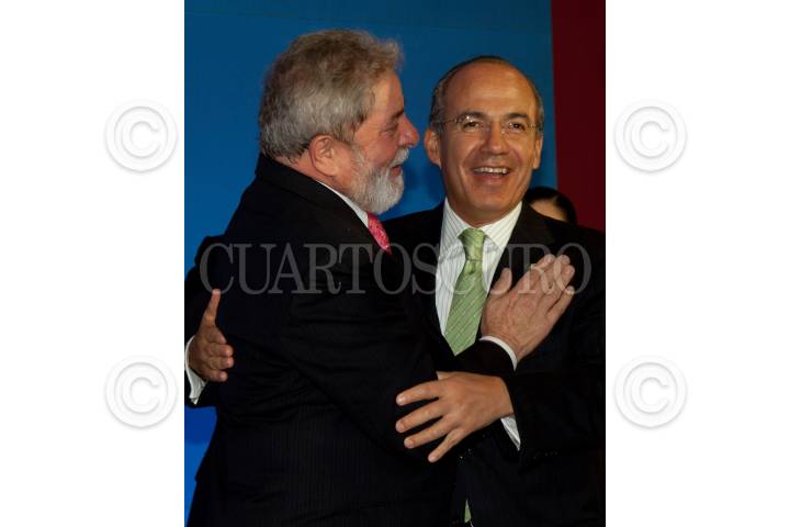 MÉXICO, D.F., 21JUNIO2011.- Felipe Calderón Hinojosa, Presidente de los Estado Unidos Mexicanos, se encontró con el ex-mandatario brasileño Luiz Inacio Lula da Silva, en la comida anual de consejeros regionales de BBVA-Bancomer. FOTO: MOISÉS PABLO/CUARTOSCURO.COM