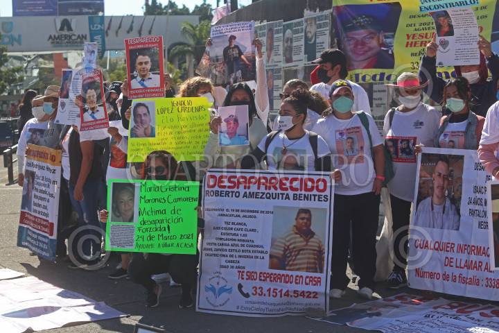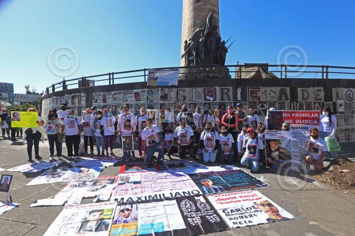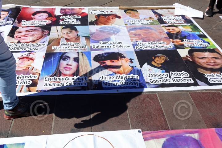 Personas del colectivo Luz de Esperanza, protestan con las imágenes de sus familiares desaparecidos.