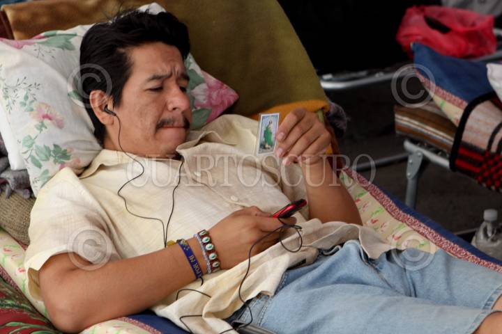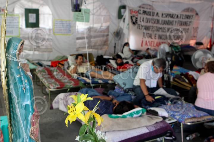 MÉXICO, D.F., 28MAYO2010.- Miembros del Sindicato Mexicano de Electricistas (SME) continúan con la huelga de hambre desde hace 32 días dentro del campamento que mantienen en la plancha del Zocalo capitalino en protesta por la extinción de Luz y Fuerza del Centro (LyFC) y exigiendo al gobierno federal los reintegre en su trabajo. Los trabajadores se encuentran cada día más débiles y con su salud más delicada. FOTO: RODOLFO ANGULO/CUARTOSCURO.COM