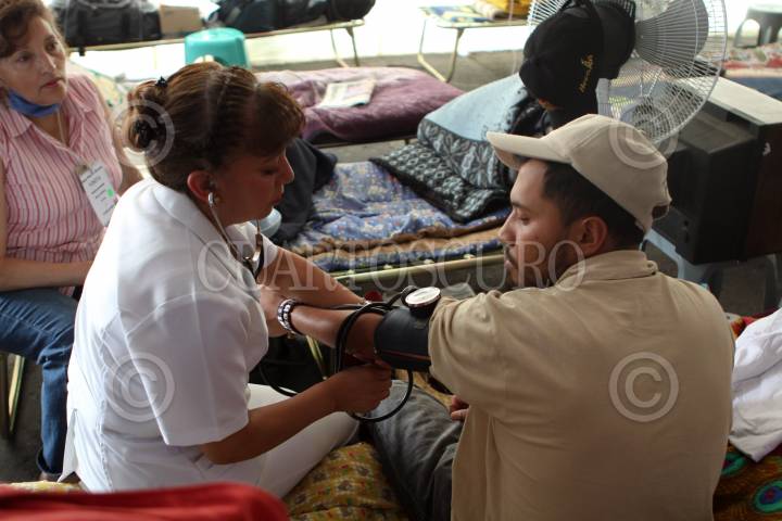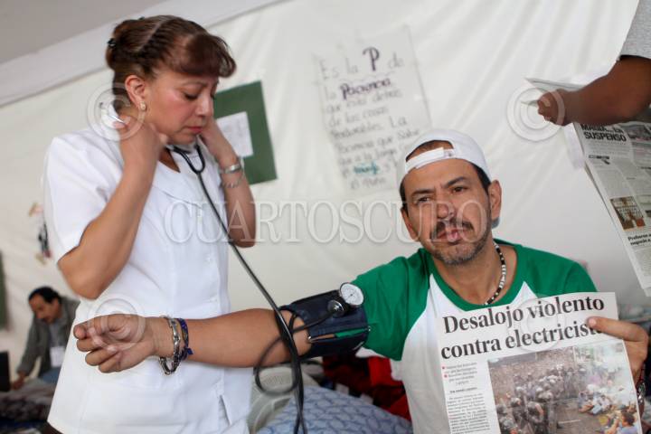 MÉXICO, D.F., 28MAYO2010.- Un miembro del Sindicato Mexicano de Electricistas (SME) que continua con la huelga de hambre desde hace 32 días es atendido por una enfermera que continuamente checa el estado de salud dentro del campamento que mantienen en la plancha del Zocalo capitalino en protesta por la extinción de Luz y Fuerza del Centro (LyFC) y exigiendo al gobierno federal los reintegre en su trabajo. Los trabajadores se encuentran cada día más débiles y con su salud más delicada. FOTO: RODOLFO ANGULO/CUARTOSCURO.COM