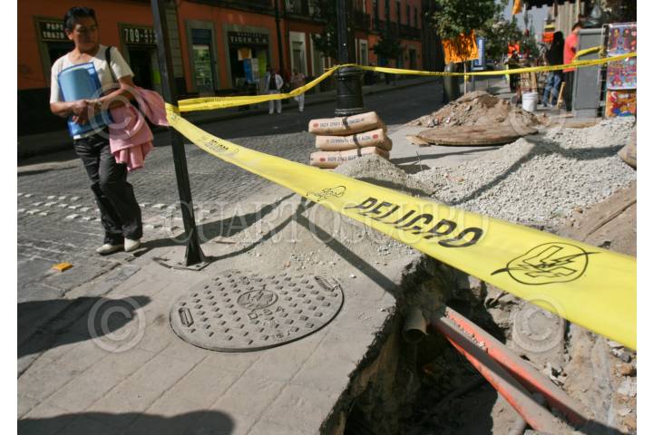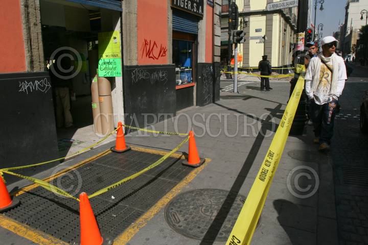 MÉXICO, D.F., 16NOVIEMBRE2010.- Se han colocado señalamientos en algunas de las zonas del Centro Histórico donde se registraron explosiones debido al mal estado del cableado eléctrico. En días pasados, La Comisión Federal de Electricidad se comprometió a realizar el mantenimiento y modernización del cableado eléctrico que se encuentra en el Centro Histórico, según informó el Marcelo Ebrard Casaubón, jefe de Gobierno del Distrito Federal. FOTO: ISAAC ESQUIVEL/CUARTOSCURO.COM