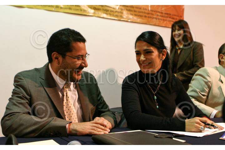 MÉXICO D.F., 26SEPTIEMBRE2008.- El secretario de Desarrollo Social, Martí Batres conversa con la periodista Lydia Cacho durante un evento de entrega de 500 tarjetas a mujeres derechohabientes del Seguro contra la Violencia Familiar. FOTO: RODOLFO ANGULO/CUARTOSCURO.COM