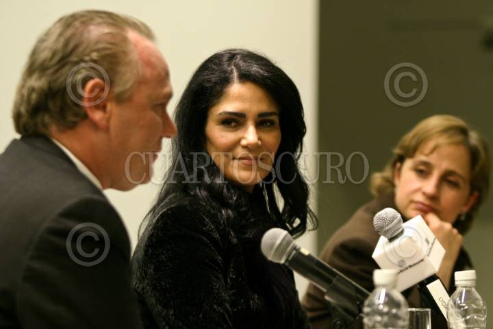 MÉXICO D.F. 08ENERO2009.- El editor Cristobal Pera, la periodista y escritora Lydia Cacho y la periodista Carmen Aristegui durante la presentación del libro titulado: "Con mi Hij@ NO, Manual para prevenie, entender y sanar el abuso sexual" que se presento en el centro cultural Bella Epoca. FOTO: RODOLFO ANGULO/CUARTOSCURO.COM