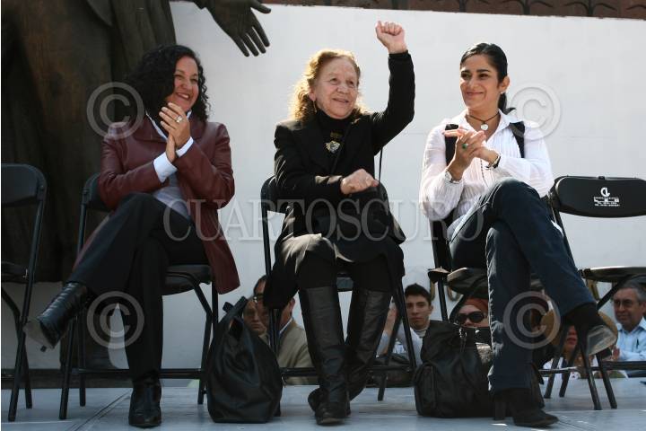 MÉXICO, D.F., 10ENERO2009.- Sanjuana Martínez, Rosario Ybarra de Piedra y Lydia Cacho, durante el mitín en favor de Carmen Aristegui, quien regresa a la radio con un nuevo programa en la estación 102.5 de FM este lunes, la concentración se realizó en el monumento a José Martí en la Alameda Central. FOTO: MOISÉS PABLO/CUARTOSCURO.COM