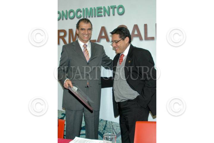 MÉXICO D.F., 25NOVIEMBRE2009.- José Cacho, hermano de la periodista Lydia Cacho recibio a nombre de su hemana el reconocimiento "Hermila Galindo" 2009 de parte de Luis Gonzalez Plascencia, presidente de la Comisión de Derechos Humanos del Distrito Federal durante una ceremonia de entrega que se celebro en el auditorio Digna Ochoa de la CDHDF. FOTO: RODOLFO ANGULO/CUARTOSCURO.COM