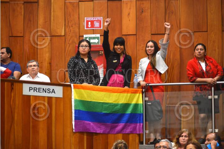 XALAPA, VERACRUZ, 21MAYO2018.- Activistas LGBTTTI se manifestaron en el Congreso local en rechazo a la iniciativa de Más Vida, Más Familia. Los integrantes de esta organización habáin asistido al congreso, pero se retiraron disgustados luego de que su propuesta donde se votaría el decreto que reforma y adiciona diversas disposiciones de la constitución política del estado de Veracruz en materia de participación ciudadana, fortalecimiento de la división de poderes, familia, matrimonio y educación fuera retirada retirada de la orden del día. FOTO: ALBERTO ROA /CUARTOSCURO.COM