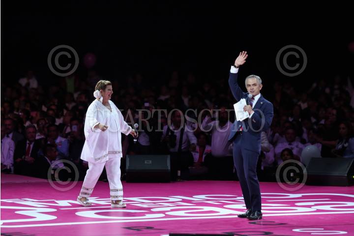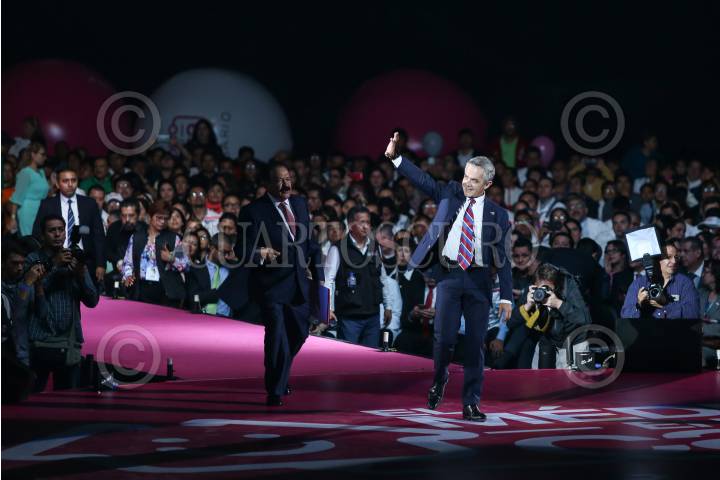 CIUDAD DE MÉXICO, 08AGOSTO2017.- Miguel Ángel Mancera, jefe de gobierno de la Ciudad de México y Armando Abued, secretario de Salud, durante el tercer aniversario del programa "Médico en tu casa". "Margarita, la diosa de la cumbia" amenizó el evento realizado en el Palacio de los Deportes. FOTO: ADOLFO VLADIMIR /CUARTOSCURO.COM