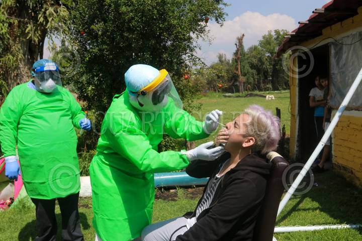 El Doctor Iván Mandujano y el Enfermero Hugo Guzmán acudieron a a realizar pruebas de Covid-19 a integrantes de una familia que lo solicitaron por teléfono al programa "Médico en tu Casa" en la chinampa de la zona "El infiernito"