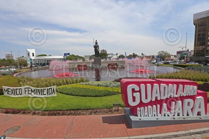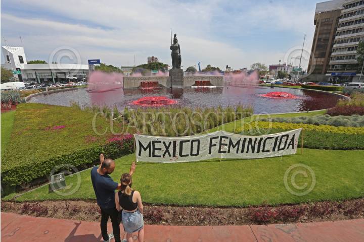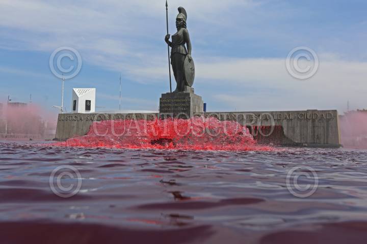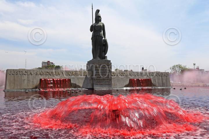Se tiñen de rojo las aguas que rodean el monumento de la Glorieta Minerva, esto previo a celebrarse el Día internacional de la mujer.
