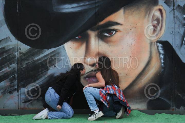 CIUDAD DE MÉXICO, 10SEPTIMBRE2023. - Dos jóvenes besan la imagen del vocalista de Fuerza Regida, Jesús Ortiz, la cual se encuentra en el Festival ARRE HSBC. FOTO: DANIEL AUGUSTO /CUARTOSCURO.COM