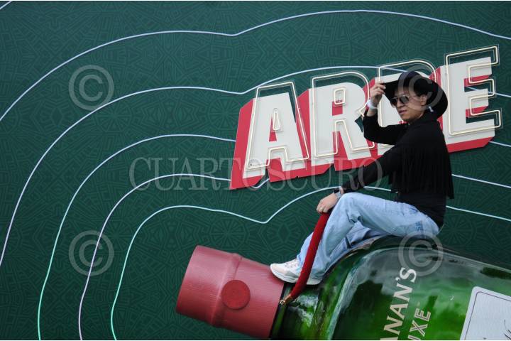 CIUDAD DE MÉXICO, 10SEPTIMBRE2023. - Una persona se toma una fotografía sobre el busto de un toro dentro del Festival ARRE HSBC 2023. FOTO: DANIEL AUGUSTO /CUARTOSCURO.COM