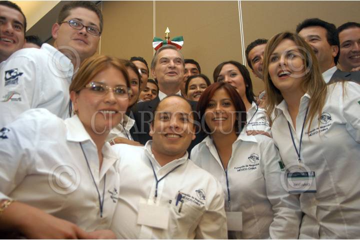 MÉXICO D.F. 16 AGOSTO2006.- El Secretario de Relaciones Exteriores, Luis Ernesto Derbez, junto con los becarios, durante la celebración del lanzamiento nacional del programa "Formación de Negociós México-China, en la cede de la secretaria. FOTO: Guillermo Perea/CUARTOSCURO.COM