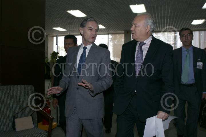 MEXICO, D.F. 14JULIO2005.- Miguel Angel Moratino, ministro de asuntos exteriores y cooperación de España y Luis Ernesto Derbez, secretario de Relaciones Exteriores durante la conferencia de prensa que ofrecieron a los medios de comunicación. FOTO: CUARTOSCURO.COM