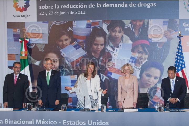 MÉXICO, D.F., 23JUNIO2011.- Carlos Tena Tamayo, titular del Consejo Nacional contra las AdiccionesJulián Ventura, subsecretario para América del Norte de la Secretaría de Relaciones Exteriores, Margarita Zavala de Calderón, Nora Volkow, directora del Instituto Nacional sobre el Abuso de Drogas de Estados Unidos, y David Mineta, director de Reducción de la Demanda de la Oficina de Control de Drogas de Estados Unidos, durante la presentación de las conclusiones de la Novena Conferencia Binacional entre ambos países sobre la Reducción de la Demanda de Drogas. FOTO: ISAAC ESQUIVEL/CUARTOSCURO.COM