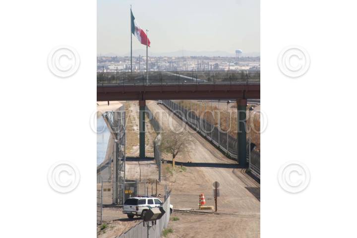 CIUDAD JUAREZ, CHIHUAHUA 02MARZO2005.- Bajo el cruce internacional Lerdo, se ve una unidad de la patrulla fronteriza que permanece vigilante para impedir el cruce de inmigrantes ilegales a territorio Estadounidense; del otro lado de la línea, ¨Trabajadores agricolas fronterizos¨, organización que agrupa a los campesinos de Texas y Nuevo México, protestan contra el informe del Centro de Estudios de Inmigración que indica que los inmigrantes tienen un costo de 70 mil millones de dólares a los estadounidenses. FOTO: Guadalupe Perez/CUARTOSCURO.COM