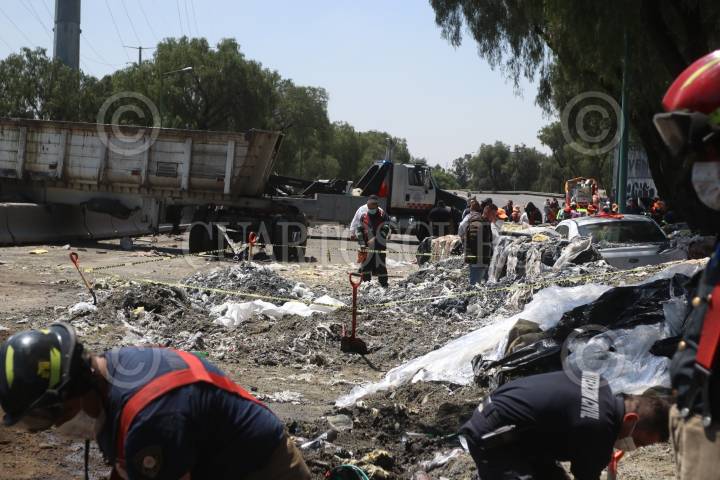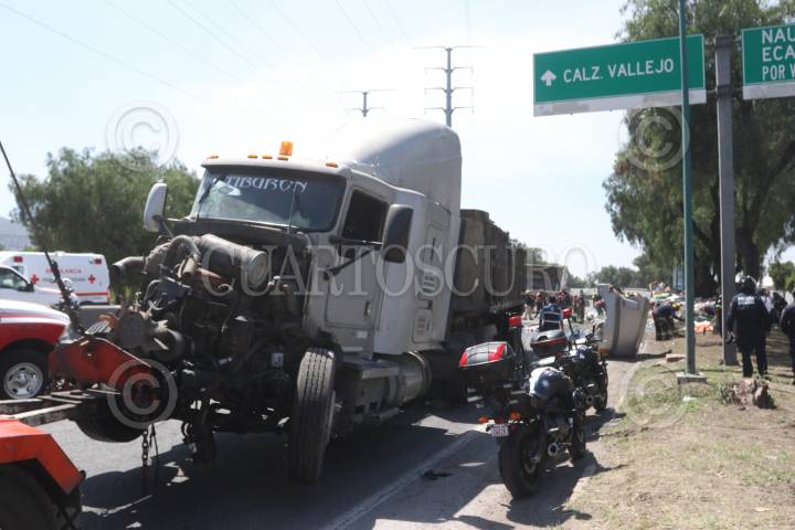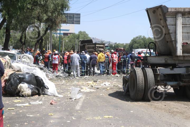 Un tráiler volcó en el entronque de Jesús Reyes Heroles y la autopista México-Querétaro, su carga quedó regada en el asfalto, parte de esta cayó sobre un trabajador provocando su muerte.