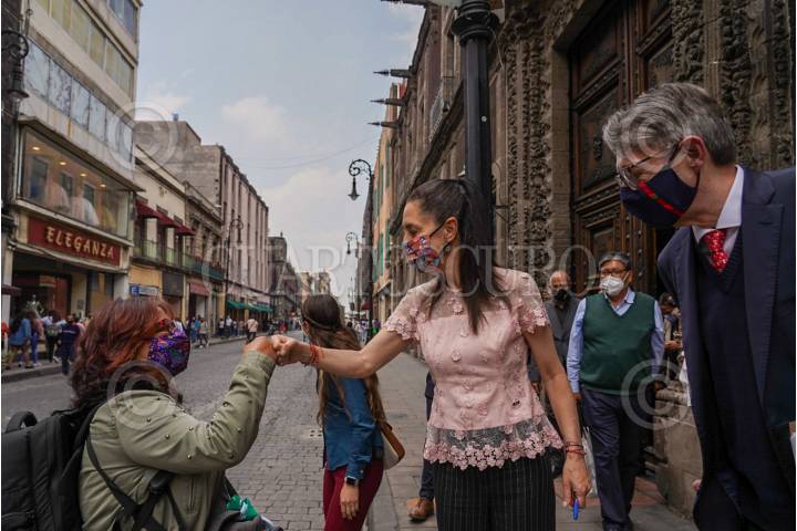 Claudia Sheinbaum y Alfonso Suárez del Real caminaron por las calles del Zócalo donde fueron instaladas placas del significado de Tenochtitlán.