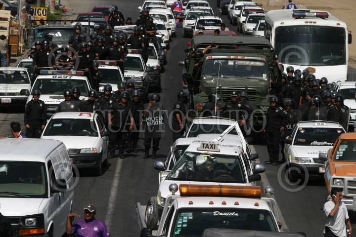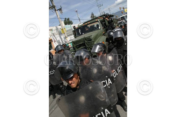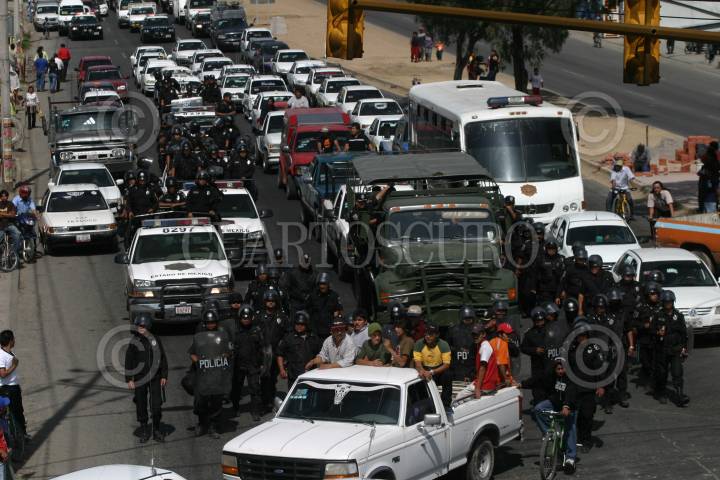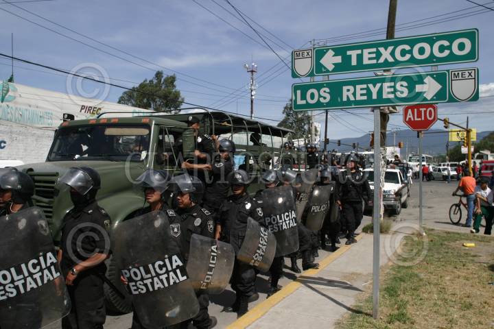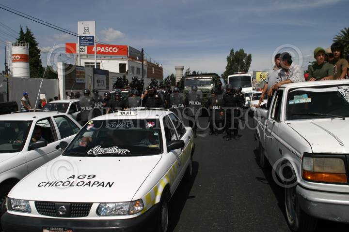 1012Est4.jpg.CHICOLOAPAN. EDOMEX,12OCTUBRE2007.-Un camión del Ejército mexicano se impactó contra un taxi a la altura del kilómetro 30 de la carretera federal México-Texcoco, dejando un saldo de tres personas muertas y tres lesionados. En la imagen granaderos del Estado de Mexico escoltan al camion del ejercito debido al MP debido a que taxistas y pobladores pretendian retener a los uniformados. FOTO: SAUL LOPEZ/CUARTOSCURO.COM