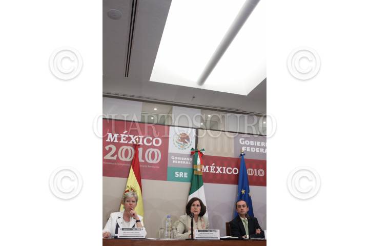 MÉXICO, D.F., 12MAYO2010.- Marie-Anne Coninsx, jefa delegacional europea en México, Silvia Escobar, embajadora en misión especial para las cuestiones referentes a los derechos humanos del Reino de España y Juan Manuel Gómez Robledo, subsecretario para asuntos multilaterales y derechos humanos de la Secretaría de Relaciones Exteriores, encabezaron la rueda de prensa tras finalizar la 1a reunión bilateral México-UniónEuropea sobre derechos humanos, esto en instalaciones de la cancillería. FOTO: MOISÉS PABLO/CUARTOSCURO.COM