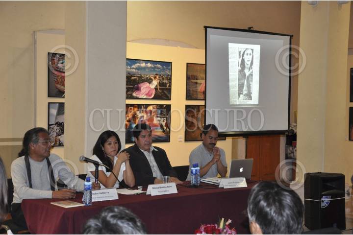 ZACATECAS, ZACATECAS, 07OCTUBRE2011.- La historiadora Mónica Morales Flores (centro), ofreció una conferencia de prensa donde dio pormenores del trabajo de investigación doctoral sobre las imágenes históricas del fotógrafo zacatecano Pedro Valtierra que ha realizado durante su carrera como fotoperiodísta en México y el mundo. Ésto se realizó en la Fototeca de Zacatecas Pedro Valtierra, con la asistencia del legendario fotógrafo y director Pedro Valtierra. FOTO: FRANCISCO SEGURA/CUARTOSCURO.COM