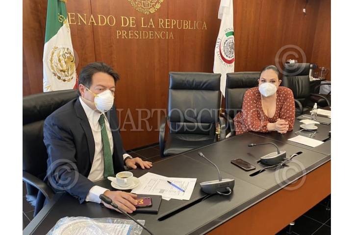 CIUDAD DE MÉXICO, 01MAYO2020.- Mónica Fernández Balboa, presidenta de la Cámara de Senadores y Mario Delgado, coordinador de Morena en la cámara de diputados se reunieron para consultar vía telefónica al doctor Hugo López Gatell sobre las sesiones extraordinarias. El subsecretario fue claro recomendando no realizarlas de manera presencial. FOTO: CUARTOSCURO.COM