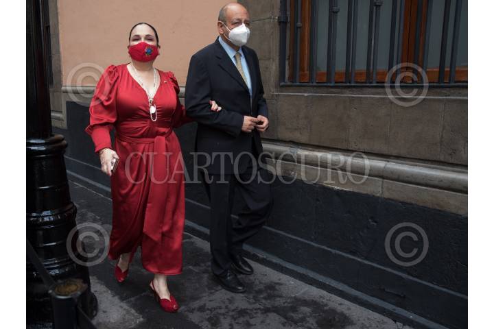 Mónica Fernández, presidente de la Mesa Directiva de la Cámara de Senadores, y su esposo Carlos Rojas Gutiérrez, durante su llegada a la antigua sede del Senado Xicoténcatl.