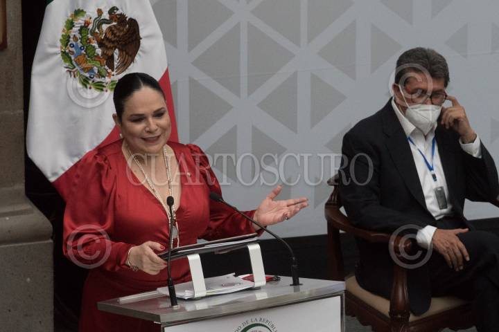 Mónica Fernández, presidenta de la Mesa Directiva de la Cámara de Senadores, ofreció su segundo informe de actividades legislativas en la antigua sede del Senado Xicoténcatl. La acompaña Ricardo Monreal, senador y coordinador de Morena.