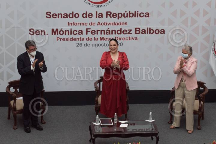 Mónica Fernández, presidenta de la Mesa Directiva de la Cámara de Senadores, ofreció su segundo informe de actividades legislativas en la antigua sede del Senado Xicoténcatl. La acompaña Ricardo Monreal, senador y coordinador de Morena, y Olga Sánchez Cordero, secretaria de Gobierno.