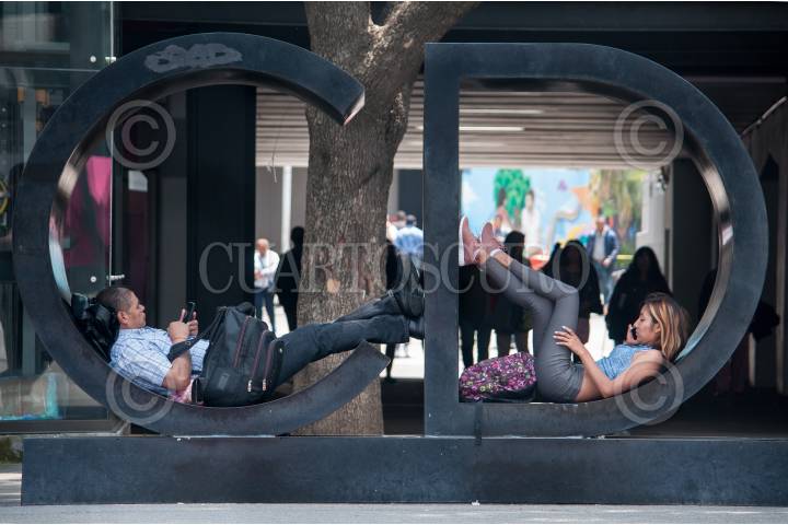 CIUDAD DE MÉXICO, 08SEPTIEMBRE2018.- El uso del teléfono celular es parte fundamental en la vida diaria de las personas para poder comunicarse, en la imagen, dos capitalinos utilizan sus móviles acostados en una escultura ubicada en la glorieta de los Insurgentes. FOTO: DIEGO SIMÓN SÁNCHEZ /CUARTOSCURO.COM