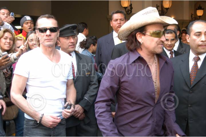 MEXICO D.F. 14 FEBRERO 2006.- Bono y Larry Mullen, integrantes del grupo de rock irlandès U2 salieron unos momentos del hotel para saludar a los fans y presentarse con la prensa. Foto:Carlos Guzmàn/CUARTOSCURO.COM