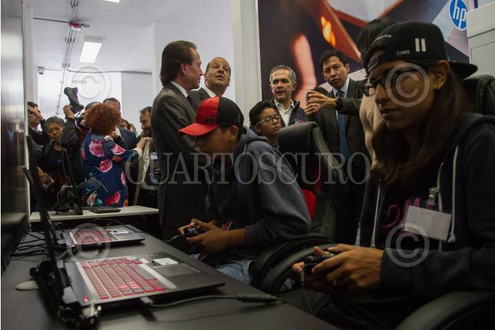 CIUDAD DE MÉXICO, 18DICIEMBRE2017.- La “Aldea Digital Telmex Telcel” se inauguró esta tarde en la colonia Ejército de Oriente, Iztapalapa, a donde se dan talleres y se aprende el uso de las tecnologías digitales. En la imagen, Miguel Ángel Mancera, jefe de Gobierno local, durante un recorrido por las instalaciones. FOTO: ISAAC ESQUIVEL /CUARTOSCURO.COM