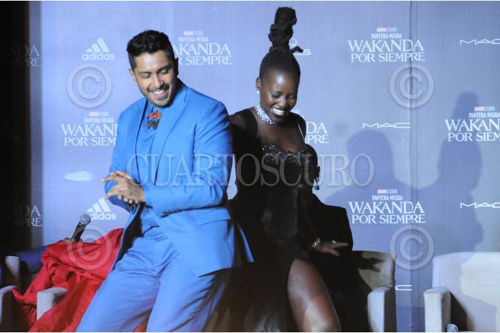 Tenoch Huerta y Lupita Nyongo bailan durante la conferencia.