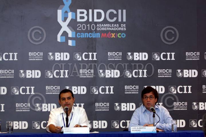 CANCÚN, QUINTANA ROO 23 MARZO2010.- Ernesto Cordero secretario de hacienda, acompañado por Luis Alberto Moreno durante la conferencia de prensa que ofrecieron al termino de la reunión anual de Gobernadores del Banco Interamericano de desarrollo. FOTO: AMARANTA PRIETO/CUARTOSCURO.COM