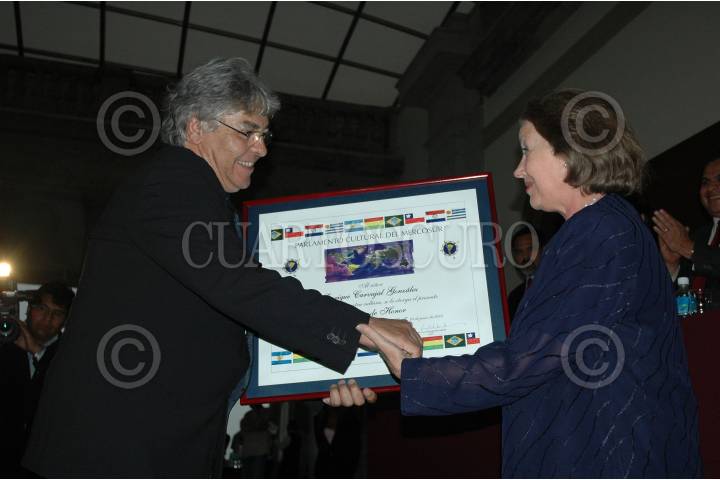 MEXICO, D.F. 24JUNIO2005.- El novelista Fernando del Paso recibió la presea que le otorgó el Parlamento Cultural del MERCOSUR (PARCUM) por su labor de manos de Sari Bermudez, presidenta de CONACULTA. Esto en el alcázar del Castillo de Chapultepec. FOTO: Iván Stephens/CUARTOSCURO.COM