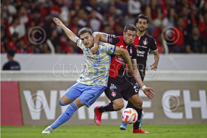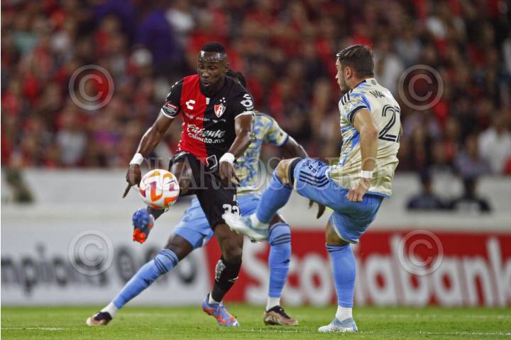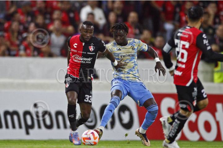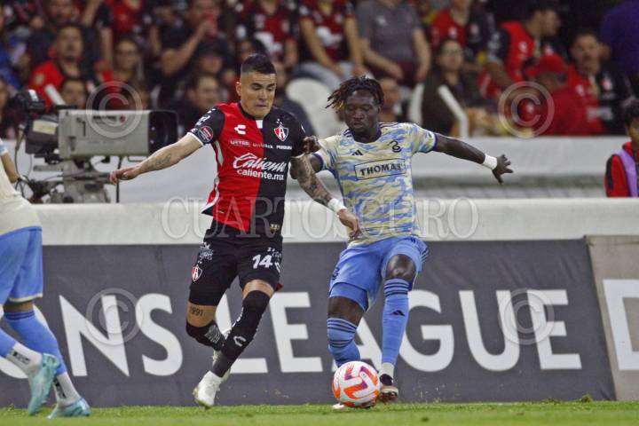 Julián Quiñonez, jugador de Atlas, disputa el balón con el contrario de Philadelphia Kai Wagner, esto en partido correspondiente a los cuartos de final de la Concachampions.