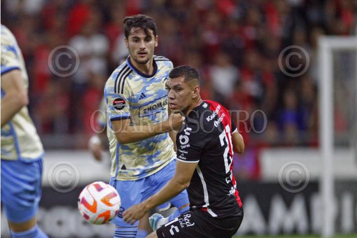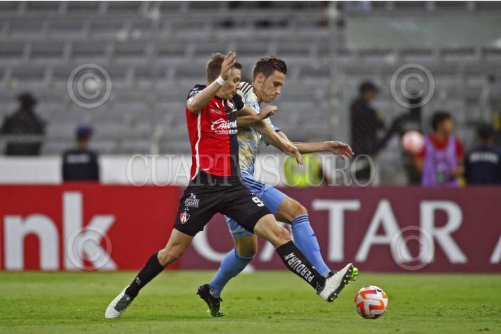 Carlos Robles, jugador de Atlas, disputa el balón con el contrario de Philadelphia Julián Carranza, esto en partido correspondiente a los cuartos de final de la Concachampions.