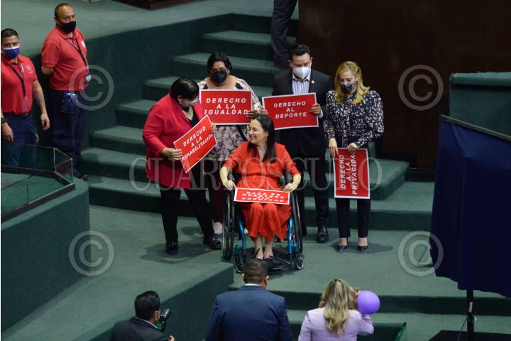 Rosa Elia Morales Tijerina, diputada del PRI, durante su participación y junto a compañeros de bancada, mostró cartulinas en apoyo las personas que vivan con alguna discapacidad.