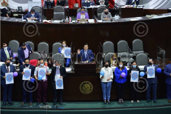 Ismael Sánchez Hernández, diputado del PAN, e integrantes del mismo grupo parlamentario mostraron una cartulinas en apoyo al dictamen de la Ley General de Salud en materia de diabetes y sus diferentes tipos.