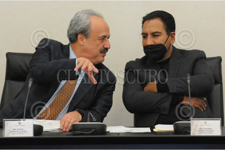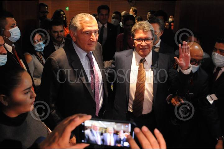 Adán Augusto López, secretario de Gobernación y Ricardo Monreal, coordinador de la bancada de Morena en el Senado, salen de la reunión.