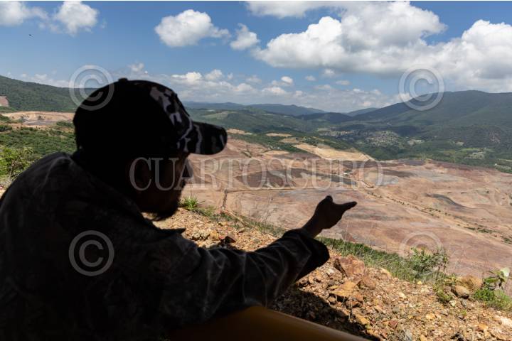 EDUARDO NERI, GUERRERO, 10JULIO 2025.– Más de tres meses han pasado desde que la comunidad de Carrizalillo cerró el acceso al complejo minero Los Filos, operado por la empresa canadiense Equinox Gold. El bloqueo, instalado de forma pacífica, responde a demandas por la degradación ambiental de su territorio y por la falta de acuerdos justos tras casi dos décadas de actividad extractiva. Los ejidatarios exigen la restauración de sus tierras y una compensación por los daños provocados por la operación minera, que —según denuncian— ha contaminado manantiales con arsénico y metales pesados, y dejado las parcelas estériles. En abril de 2025, la empresa suspendió operaciones de manera unilateral y despidió a trabajadores locales, afectando directamente a unas 176 familias. “Si la minera ya se quiere ir, que nos devuelvan las tierras en condiciones para sembrar”, señalaron representantes ejidales. Equinox Gold ha propuesto renovar el convenio de ocupación con una reducción del 63% en los pagos por hectárea y una extensión del contrato hasta 2045. La comunidad rechazó esta propuesta y, en respuesta, enfrenta actualmente demandas por parte de la minera, que la acusa de despojo. Inspecciones de la Profepa detectaron filtraciones de residuos tóxicos al Río Balsas y almacenamiento de materiales peligrosos al aire libre, sin medidas de contención. La comunidad sostiene el bloqueo y exige que las autoridades obliguen a Equinox Gold a asumir sus responsabilidades ambientales y sociales. En la imagen, ejidatario muestra las instalaciones de la mina donde antes se encontraban sus parcelas. FOTO: ADOLFO VLADIMIR /CUARTOSCURO.COM