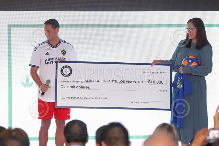 El futbolista mexicano de Los Angeles Galaxy Javier Hernández entrega un donativo económico a la directora del albergue infantil Los Pinos, Argelina Reyes, durante una rueda de prensa en Guadalajara.