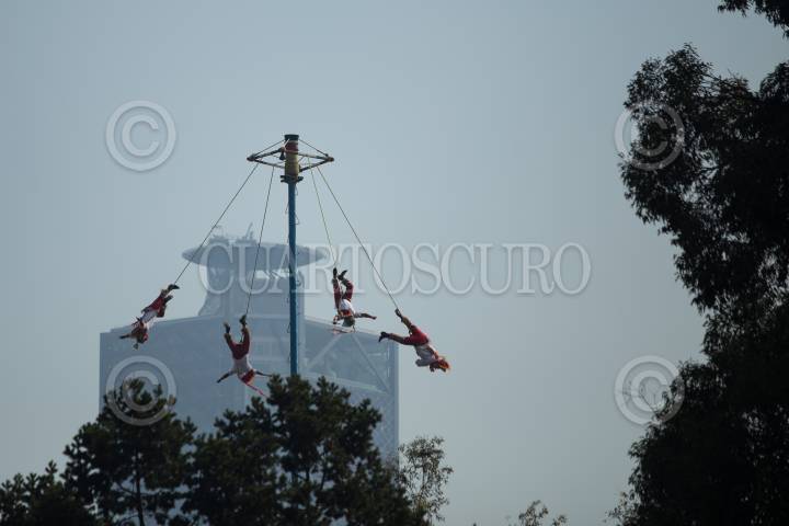 CIUDAD DE MÉXICO, 20DICIEMBRE2017.- Contraste de la ciudad, voladores de Papantla frente al Museo Naional de Antropología. FOTO: ADOLFO VLADIMIR /CUARTOSCURO.COM