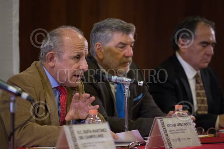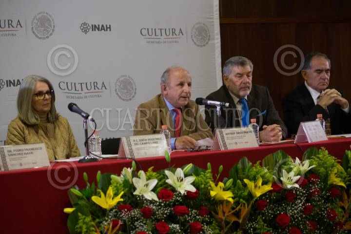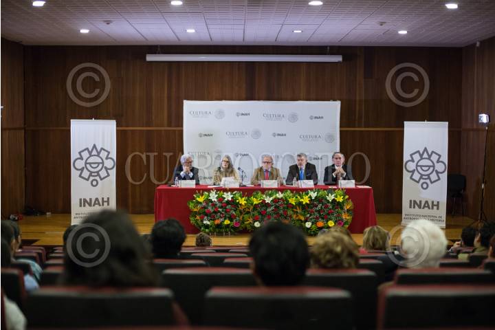 CIUDAD DE MÉXICO, 30AGOSTO2018.- Pedro Francisco Sánchez Nava, Coordinador Nacional de Arqueología, Sofia Martínez del CAmpo Lanz, coordinación Nacional de Museos y Exposiciones, Diego Prieto, director del Instituto Nacional de Antropología e Historia, José Enrique Ortiz Lanz, Coordinador Nacional de Museos y Exposiciones y BAltazar Brito Guadarrama, director de la Biblioteca Nacional de Antropología e Historia, durante la presentación del simposio "El Códice Maya de México, antes Grolier" que se llevara a cabo el 30 y 31 de agosto en el auditorio Jaime Torres Bodet del Museo Nacional de Antropología. FOTO: ADOLFO VLADIMIR /CUARTOSCURO.COM