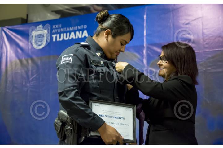 TIJUANA, BAJA CALIFORNIA, 08MARZO2018.- En el marco del Día Internacional de la Mujer, el ayuntamiento de la ciudad reconoció a la agente María Teresa García, con la medalla al mérito por su labor en beneficio de las mujeres. Durante el evento se reconoció la labor de las mujeres en acciones de la corporación policiaca. FOTO: CUARTOSCURO.COM