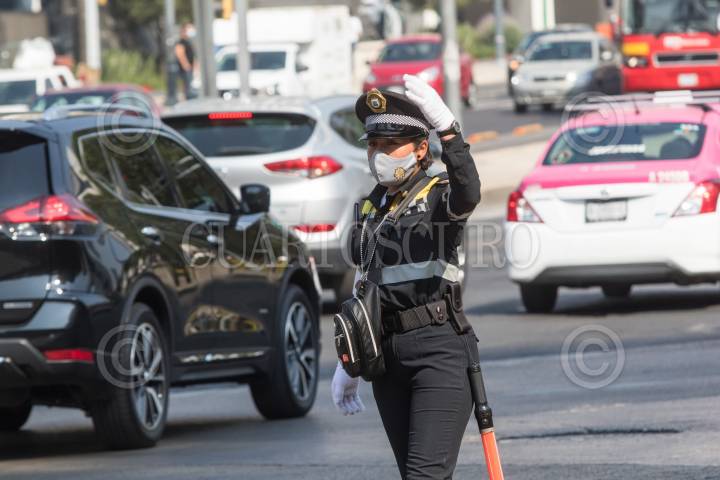 Un mujer policía con cubrebocas agiliza el tránsito en el cruce de Reforma e Insurgentes.