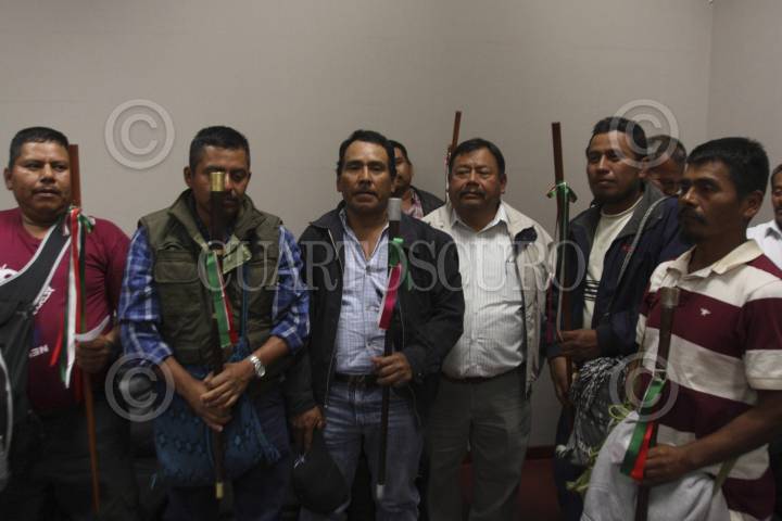 OAXACA, OAXACA, 25ENERO2012.- Uriel Díaz Caballero (al centro con chamarra café), líder del Movimiento Unificador de Lucha Triqui (MULT) posa al lado de agentes y presidentes municipales de la zona triqui, esto previo a la reunión que sostuvieron con el gobernador del estado, Gabino Cué y representantes de la UBISORT y MULTI esto para signar el "Acuerdo de Paz y de Concordia para la Región Triqui". FOTO: ARTURO PEREZ ALFONSO/CUARTOSCURO.COM