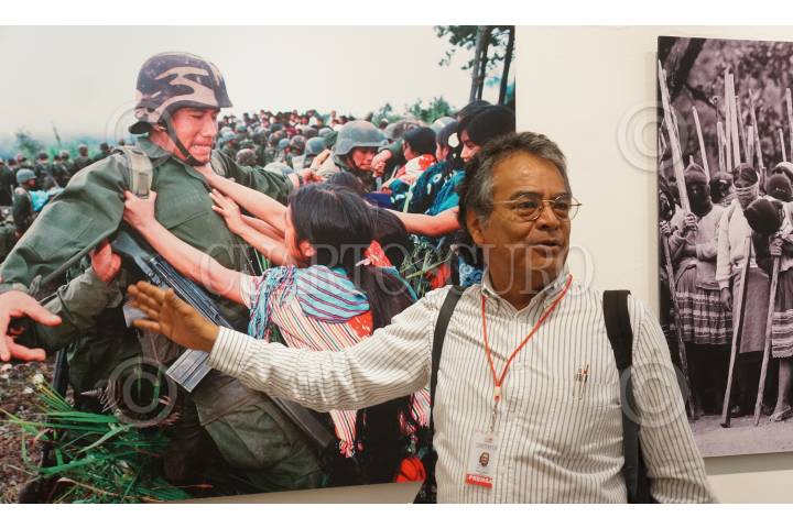 GUADALAJARA, JAL., 05 SEPTIEMBRE2013.- Pedro Valtierra frente a la fotografía ganadora del Premio Internacional de Periodismo Rey de España 1998. La exposición "Pedro Valtierra: Mirada y testimonio", constituida por 150 imágenes producto de sus 38 años de experiencia en el fotoperiodismo, se inaugurará mañana en el Museo del Periodismo y las Artes Gráficas (MUPAG) a las 19:00 horas. El periodista Diego Petersen y Ana Luisa Anza, editora y coordinadora editorial de la revista Cuartoscuro, presentarán el libro-catálogo homónimo de la exposición. La muestra se presentó el año pasado en el Centro Cultural Universitario Tlatelolco de la UNAM, con la investigación y curaduría del Dr. Alberto del Castillo y la maestra Mónica Morales, ambos del Instituto Mora. FOTO: ANA COSTABILE /CUARTOSCURO.COM